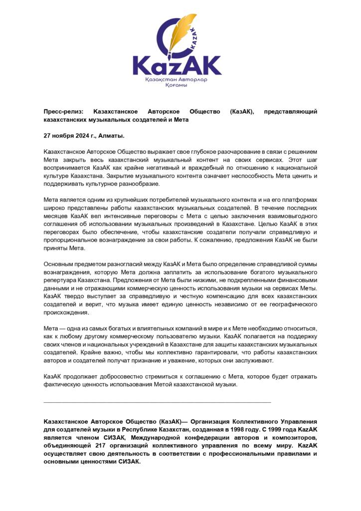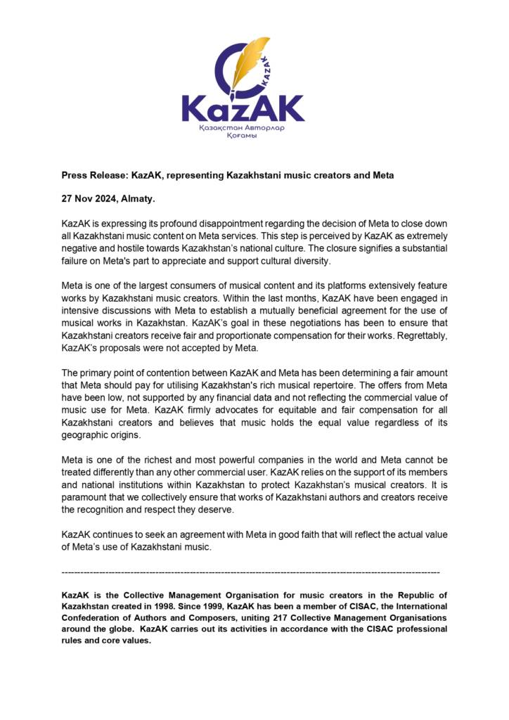 Пресс-релиз CISAC: «КазАК реагирует на удаление Meta казахстанского музыкального контента»